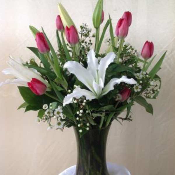 Tulip arrangement was out of season but company quickly reached out to me to determine a good replacement. Gave me a beautiful daisy arrangement.