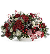 An instant Christmas party, this festive bouquet bursts with fresh blooms of red and creme colored roses with winter greens and fun-filled candy canes