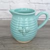 Beeautiful Pitcher is A Ladybug Floral exclusive bouquet. This bouquet features asiatic lilies, snapdragons, football mums, alstroemeria, roses, carnations and monte casino. Featured in a teal artisan ceramic pitcher with an embossed bee motif.