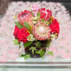 This long-lasting arrangement of red Roses, Protea and fragrant Hyacinth are nestled in a short glass vase accentuated with wax flower and ivy.