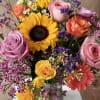 Catie is a cat friendly arrangement! It will consist of wax flowers, limonium, gerbera daisies, roses, spray roses and sunflowers, depending on availability of flowers. COLORS will have variation depending on availability of flowers.