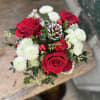 Send some holiday cheer with this adorable candy cane striped tin filled with seasonal flowers. With red roses, white mums, fresh evergreens, pinecones and glass balls, this arrangement is sure to last and look great, even when the fresh flowers fade. Just pop out spent blooms as they fade and enjoy this through the Christmas season (if not longer!).
