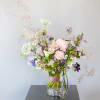 A soft Blush Ivory color palette create with Peony, Anemone, and seasonal delicate bloom, decorate with lily glass weaving accent. The elegant fragrant definitely will bring your attention. This handtie bouquet with ribbon wrap in 7" tall vase and packed with our branded gift box.