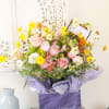 This exquisite bouquet features delicate coral peachy garden rose, ranunculus, hydrangea with seasonal dancing wildflower and greenery create a whimsical harmonious blend of beauty and fragrance. Perfect for any occasion- be it a birthday, anniversary, or simply to brighten your day. Our bouquet crafted with love and attention to detail, our arrangement are not just flowers, they are expressions of love and happiness. We recommend this arrangement in the tall cylinder vase