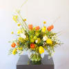 A cheerful Orange, yellow and Ivory Tulip combination handtie bouquet. This arrangement create with seasonal lisianthus and bloom in 8" ball glass vase