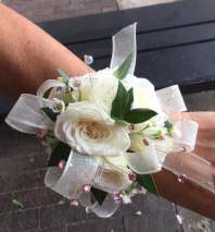 Wrist Corsage with gold ribbon with rhinestones with a rhinestone bracelets. This corsage is made with white spray roses and a gold ribbon with iridescent rhinestones and a rhinestone bracelet. Gold ribbon can be change upon request in the special notes to any color. Please add in special notes. Only ribbon color can be changed. no same day orders