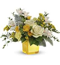 Sunny yellow flowers include roses, asiatic lilies, gladioli and miniature carnations, all mixed with soft green button spray chrysanthemums, carnations and variegated pittosporum.
