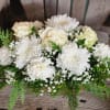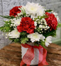 An elegant mix of all-white winter blooms is artfully arranged in a rustic wooden box, creating a look that’s both timeless and cozy. Soft, snowy tones and natural textures make this arrangement perfect for winter décor, holiday gatherings, or thoughtful seasonal gifting.