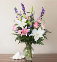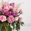 Enjoy this elegant and sentimental arrangement of roses, astilbe, ranunculus, stocks, tulip and carnations