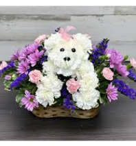 Loveable little flower pup nestled in a colorful basket of assorted blooms. Who loves doggie kisses? Do the doggies get on the furniture and get more treats than the humans in the household? This one is for the doggie lovers. Let us know the name of the pet and we will add a paper dog tag.