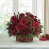 The scents of the season! Christmas greens, bold red flowers and cinnamon sticks make this a fragrant floral arrangement for Christmas gatherings.