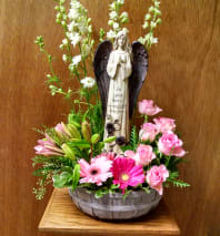 This arrangement is designed in a designer wicker container.  The angel maybe vary from the picture.