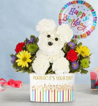 EXCLUSIVE Our truly original 3D pup is a precious Mother’s Day surprise. Crafted from white carnations, with sweet pink blooms all around and a butterfly accent, this canine creation is designed in a dog bed basket.