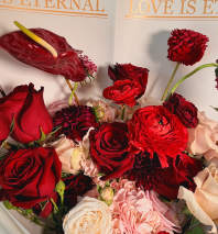 Introducing our captivating flower arrangement, a perfect blend of romance and bohemian flair. This exquisite ensemble features the timeless allure of red roses, complemented by an assortment of charming pink flowers. Adding a touch of rustic elegance, we've incorporated the unique charm of dry palm leaves, creating a captivating contrast. Carefully curated to balance classic beauty with a trendy twist, this arrangement is a statement piece that captures the essence of both tradition and contemporary style. Elevate your space with the harmonious fusion of lush blooms and the enduring appeal of dried elements.