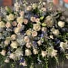 An abundant high-end design of lush roses, delphinium and Casa Blanca Lilies in a soft white and light blue "celste" color palette. Please let us know in the comments if it will be an open or closed casket.