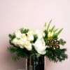 White roses, peonies and assorted white florals among holiday greens and ornaments make for a beautiful and elegant, yet festive floral design.