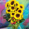 An arrangement in a clear vase made of sunflowers, Lillies, and greenery