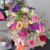 Featuring a romantic blend of premium seasonal blooms in soft pink, cream, lavender, and pastel tones, the arrangement creates a lush and airy garden-style look. The double-sided design makes it perfect for table displays, birthdays, celebrations, or thoughtful gifts.