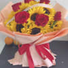 The product includes 18 sunflowers and 6 red roses, wrapped in paper.