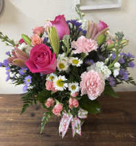 The lovely bouquet includes lavender roses, light pink roses, pink roses, light pink spray roses and lavender spray roses accented with assorted greenery.