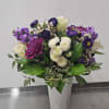 White vase full of fresh air! Purples, lavenders and whites tooled off with fillers and greenery.