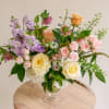 This lush arrangement features colorful pastel blooms such as roses, stock, delphiniums, hellebores, hydrangeas and more in a premium goblet vessel. This design approximately measures 18" tall and 20" wide.
