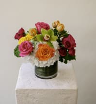 Coral and ivory garden roses meet burgundy cymbidium orchids, vibrant snapdragons, yellow spray roses in this warm-toned arrangement. Orange button mums, green hydrangea, and bells of Ireland add texture and movement throughout. Designed in a beige glazed pot, the arrangement stands approximately 20" tall and 23" wide with flowers. Same-day delivery available throughout West Los Angeles.