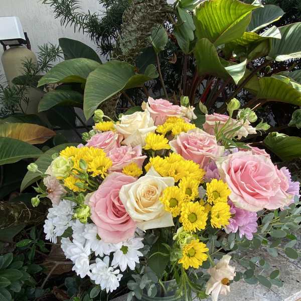Beautiful arrangement, colorful and plentiful flowers. Just exquisite.