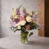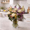 This design features a lush mix of creamy white roses, soft peach and blush blooms, lavender and buttery yellow seasonal flowers, and airy greenery, thoughtfully arranged in a sculptural clear glass vase. The color palette is fresh, cheerful, and refined. Full of life without feeling overwhelming.