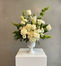 A serene and timeless arrangement, Tranquil Elegance is designed to bring effortless beauty to any space. Featuring lush white roses, delicate white florals, and complemented by linear flowers to create whimsical movement, Tranquil Elegance embodies grace and sophistication. Arranged in a modern glass vase, this design is perfect for celebrations, sympathy gestures, or simply adding a touch of refinement to your home.