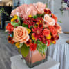 Includes Hydrangeas, Orange roses, Orange spray roses, Orange pom cushion, Orange Pom Button, Variegated Greenery, and Eucalyptus