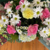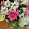 A fluffy one sided arrangement featuring daisies, carnations, roses, aster, and hydrangea.