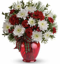 Wondrous winter whimsy for any Christmas celebration! This charming floral "tree" is presented in a lovely cardinal cube that combines festive red and white blossoms with fresh winter pine.