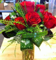 Lovely array of roses, lilies, belles of ireland, orchids and other season flowers. Done in gorgeous red, green, and white tones. Designed in a clear glass vase.