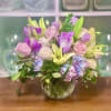 A beautiful pastel inspired arrangement of mixed flowers in a clear bubble bowl.