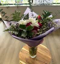 A beautiful hand-tied bouquet featuring a mix of fresh seasonal flowers including roses, lilies, snapdragons, chrysanthemums, and delicate filler flowers, accented with lush greenery. Wrapped in elegant paper and finished with a ribbon, this bouquet is perfect for birthdays, celebrations, thank-you gifts, or simply brightening someone’s day.