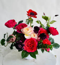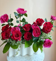 A show-stopping take on the traditional dozen rose arrangement. Unique greenery is paired with 12 premium roses and artfully arranged in a modern ceramic vase