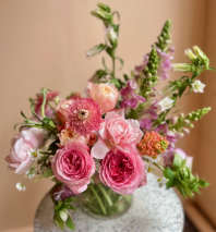 All of our favorite blooms in one vase. Beautifully designed with our freshest seasonal offerings in lovely shades of apricot, blush and white with pops of orange.