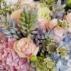 Blushing Beauty is the perfect elegant centerpiece, featuring a delicate blend of pastel blue and pink hydrangea blooms, soft pale pink roses, fragrant periwinkle blue hyacinth, and premium seasonal filler flowers. This arrangement brings a soft, romantic charm to any setting, making it ideal for celebrations, gifting, or as a beautiful addition to your home.