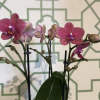 White ceramic pot filled with 3 beautiful magenta mini orchids.