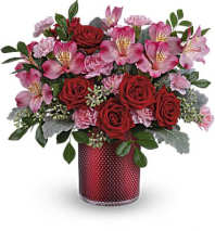 “Think pink” takes on new meaning with this vivacious bouquet, which comes in an equally vibrant hot-pink vase. Lush with roses, daisy poms, gerberas, and other blooms, this arrangement is certain to brighten their day.
