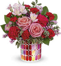 This rich bouquet features red roses, red spray roses, red alstroemeria, miniature red carnations, lemon leaf and pitta negra. Teleflora's Radiant Crimson Bouquet is delivered in Teleflora's Scarlet Diamond Cylinder.