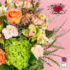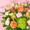 This bouquet is full of fresh garden spring flower with a combination of our staff's favorites. The vibrant green cymbidiums, peach roses and pastel garden flowers will create a stunning gift. This bouquet comes in a clear glass vase and includes a custom card message, provided by you!