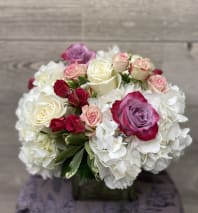 This black glass container filled with rich red roses, velvety burgundy blooms, and dramatic purple flowers come together in a striking display.