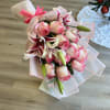 A graceful bouquet featuring bi-color pink-tipped roses paired with elegant pink lilies and fresh lily buds. Wrapped in a soft translucent sleeve and finished with a bright pink ribbon, Blushing Elegance brings a romantic, feminine touch to any occasion — perfect for birthdays, anniversaries, or simply brightening someone’s day!