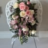 Elegant pink flower arrangement crafted with soft pink and seasonal blooms. Perfect for any occasion. Approximately 18 in wide by 24 inches tall with stand included.