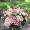 In Scandinavia, in the Viking age, Liv was a strong name for females. Liv means “Of Live”. A beautiful and natural arrangement in a clear vase in a mix of gorgeous, natural, seasonal flowers in pale pastel colors. A perfect feminine arrangement for Valentine's or any other occasion, placed in a clear 5 by 6' vase.