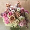 A violet, pale pink pastel arrangement with the finest colors and flowers. Very feminine and pretty arrangement placed in a clear vase 5 by 5", full of lovely pale purple, nude and blush colors. Roses of the prettiest pastels mixed with seasonal garden like flowers such as lilacs, sweet peas, anemones, peonies, dahlias or other beautiful flowers (varies according to season).