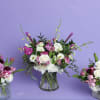 Our Violet Gardens Luxe is the elevated, grand version of our beloved cube design — thoughtfully arranged in a premium statement vase for maximum impact. This larger, lush garden-style arrangement features white hydrangea, blush and lavender roses, tulips, ranunculus, lisianthus, and rich violet accents with layered greenery for depth and movement.