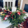 Tired of arrangements only lasting a few weeks? Try this hardy option, specifically made to be long-lasting! This table design features seasonal greens, hypericum berries, and natural pinecones combined with festive ornaments and tufts of seasonal ribbon.